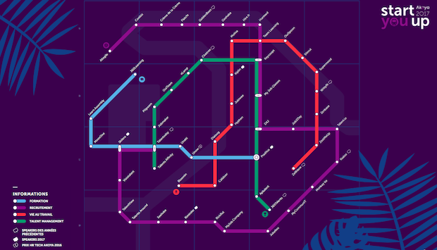 Pour mieux s’y retrouver "dans la jungle" de la HR Tech, Akoya a également dévoilé une cartographie des startups RH les plus prometteuses, sous la forme d’un plan de métro composé de 4 lignes : recrutement, talent management, formation et vie au travail.