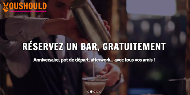 Fondée par Timothée Emery et Paul de Préville en 2014, Youshould est une plateforme gratuite de réservation de bars. La start-up vous permet de réserver une table ou de privatiser un espace tout entier, sans frais supplémentaire. Pour organiser votre soirée, il vous suffit de renseigner le nom du bar, le quartier ou l’adresse souhaitée au sein du moteur de recherche et de consulter le calendrier dynamique de réservation. Le modèle économique est simple: chaque bar paie deux euros par invité, somme compensée par une consommation moyenne de 40 euros par personne lors de l’événement. Pour les gérants, c’est un ROI largement positif et un outil de travail qui leur fait gagner du temps au quotidien.