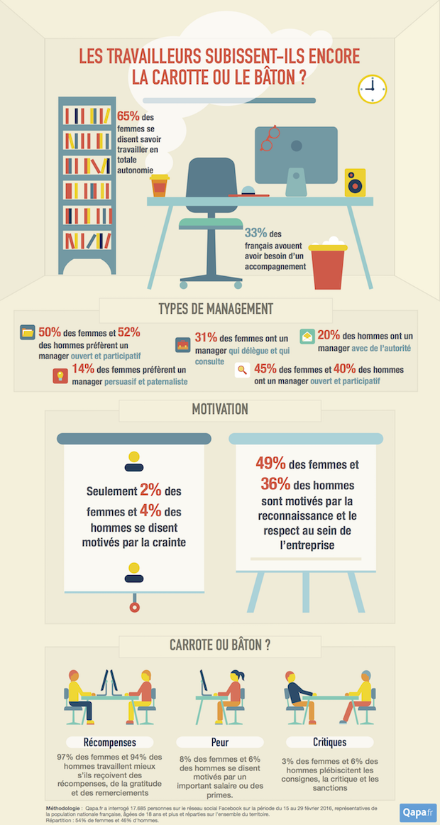 Quels types de management sont pratiqués aujourd'hui en France ? Comment sont-ils perçus par les travailleurs ? Quelles sont leurs principales sources de motivation au travail ? Autant de question auxquelles a tenté de répondre la plateforme d'emploi Qapa.fr, grâce à un récent sondage lancé sur Facebook auprès de 17 685 personnes représentatives de la population française.