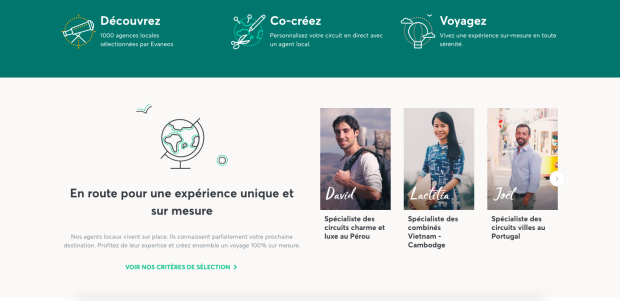 Grâce à la discussion en amont entre l'agent et les voyageurs, ces derniers bénéficient d’une multitude d’options dans les destinations (60 à ce jour), les formats et les styles de voyage. Tout peut s'adapter selon leurs envies, leurs contraintes et leur budget. Plus qu’une marketplace ou un outil de mise en relation avec les agences locales, Evaneos se veut une véritable source d’inspiration et d’information avec plus de 5000 idées de voyages à personnaliser.
