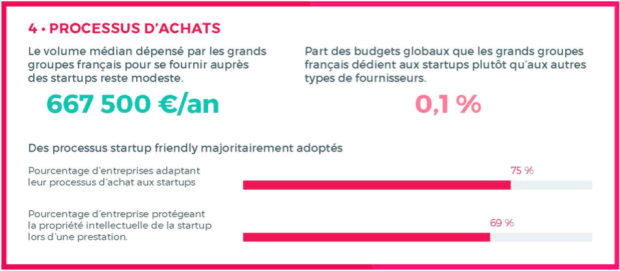 Pourtant, l’engagement des grandes entreprises françaises reste encore modeste au regard de leur poids économique : les 29 grands groupes français classés parmi les 500 plus grandes entreprises du monde ont un revenu cumulé de 1650 milliard de dollars, et n'allouent aux startups que 0,1% de ces sommes. Ce chiffre cache en réalité une forte disparité parmi ces grandes entreprises : un petit nombre d’entre elles témoignent de performances et de pratiques remarquables, autour de quatre grandes modalités d’interaction. Ainsi, dans les processus d’achats (la startup fournit des produits et/ou services aux grands groupes), ce sont la Française des Jeux, Legrand et Total qui s'illustrent par leurs bonnes pratiques en termes de collaboration avec les jeunes pousses.
