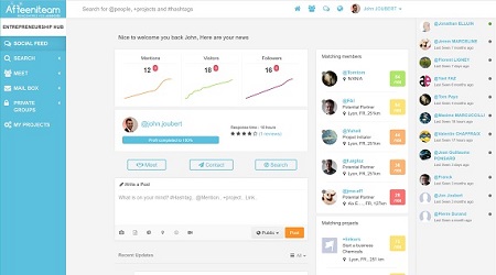 Parce que 15% des actifs ont un jour songé à l'entrepreneuriat sans passer à l'acte, et que 90% des projets n'aboutissent jamais à une immatriculation, Affeniteam est né en 2014 d'une volonté de connecter les entrepreneurs. Avec plus de 25 000 membres inscrits sur sa plateforme, Affeeniteam se présente désormais comme un hub, hybridation d’un réseau social, d’un site de rencontre et de fonctions collaboratives, pour connecter les entrepreneurs ainsi que tous les acteurs de l'entrepreneuriat.