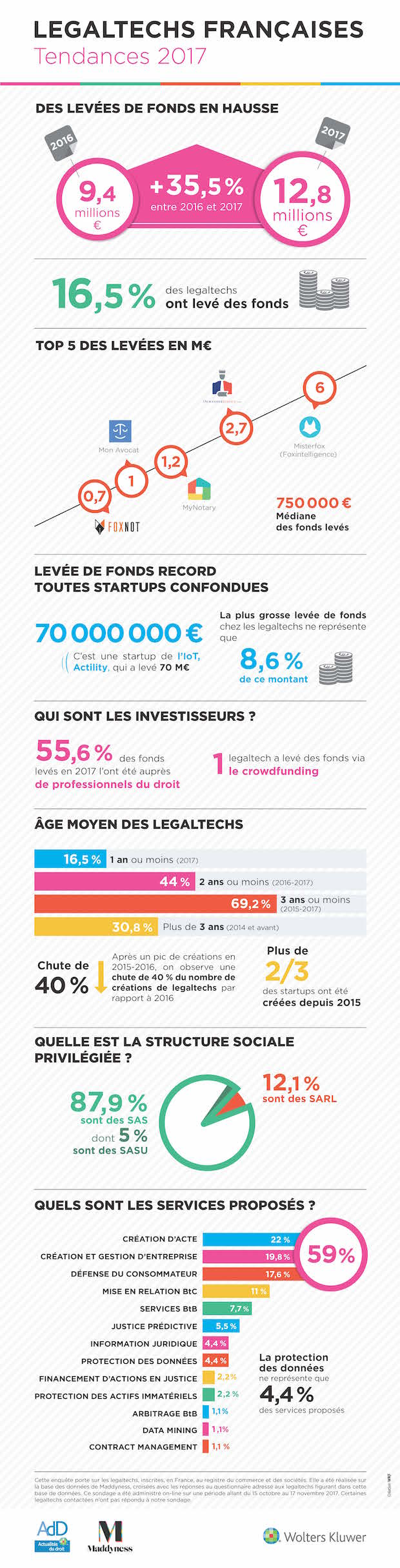 Autre enseignement de cette enquête, la nature des services proposés par les Legaltechs, qui n'ont parfois rien de très "tech" : près de 60 % concernent la création d'acte, la création et la gestion d’entreprise ou la défense du consommateur, tandis que la justice prédictive représente 5,5% des services. Ce qui est autrement plus surprenant, c'est qu'à quelques mois de l'application du régement européen sur la protection des données personnelles (RGPD), moins de 5% des legaltechs se sont lancées sur le créneau de la protection des données.