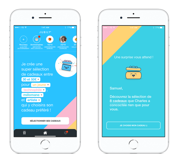 Juste à temps pour Noël, Jubily est une application qui permet de créer une sélection personnalisée de cadeaux originaux. Grâce à la technologie de recommandation, l’application propose une liste de cadeaux parmi 180 enseignes (The Kooples, Nuxe, L’Exception, Clarins, L’Avant Gardiste...). La sélection est ensuite envoyée au destinataire qui peut la découvrir en cliquant sur un lien reçu par message. Les proches n’ont plus qu’à choisir LE cadeau qui leur conviendra sans jamais en connaître le prix.
