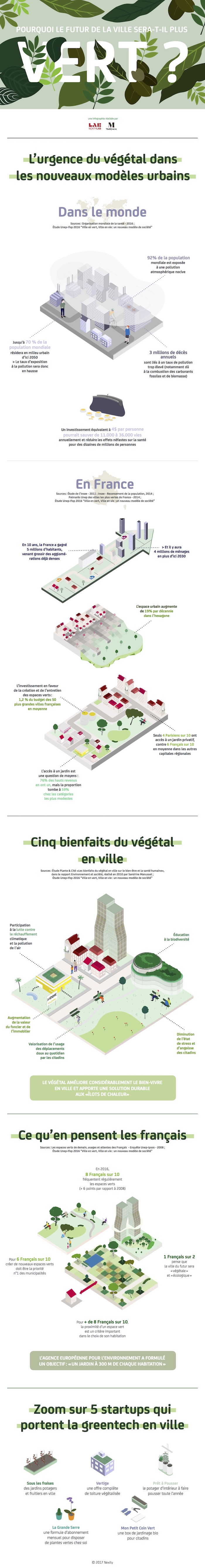 S’il en va en partie de la responsabilité des élus locaux de prioriser davantage la végétalisation de l’espace urbain, les entreprises et les habitants eux-mêmes ont aujourd’hui les moyens de rendre leur environnement plus vert. Sous les fraises, Vertige, Prêt à Pousser, La Grande Serre, Mon Petit Coin Vert : les cinq startups GreenTech citées dans l’infographie en sont d’ailleurs l’exemple parfait. Let’s go green ?