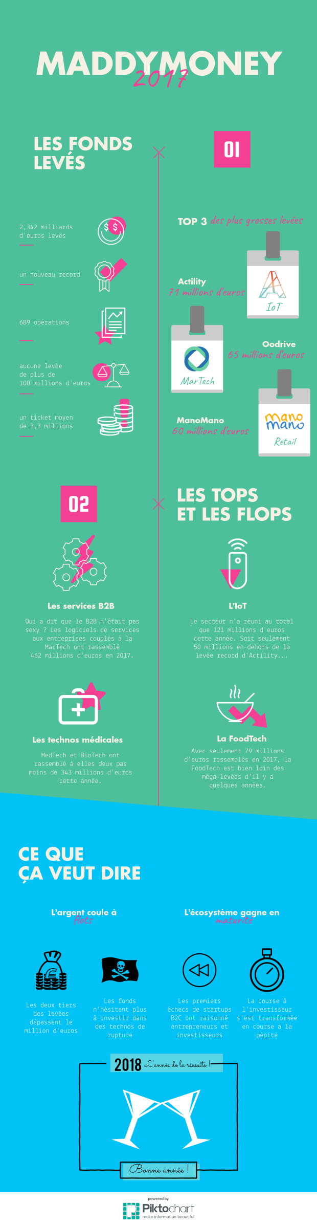 Dans une moindre mesure, la FinTech a elle aussi eu un effet déceptif. Avec 155 millions d'euros levés en 2016, elle était alors le secteur prometteur pour 2017. Logiquement, après une phase de croissance marquée par les levées, le secteur a profité de l'année pour se structurer, ce qui explique notamment qu'un seul acteur se soit hissé dans le Top 10 des levées (Younited Credit, 40 millions d'euros) et que plusieurs jeunes pousses se soient rapprochées de grands groupes (Compte-Nickel, Pumpkin, KissKissBankBank). La tendance pourrait s'inverser en 2018, plusieurs néobanques s'étant lancées en 2017. Elles pourraient ainsi profiter de cette année pour accélérer grâce à quelques hold-ups... sauf si les startups étrangères du secteur raflent la mise.
