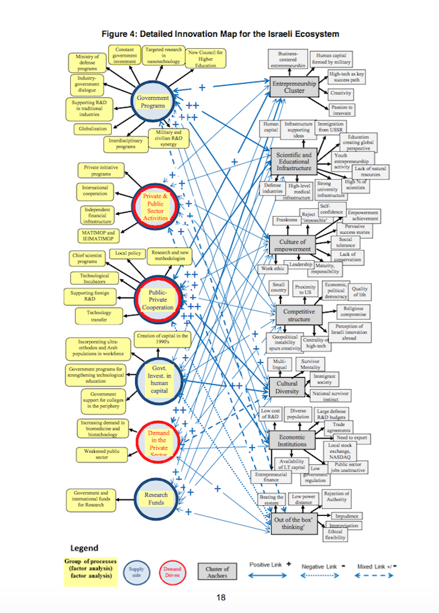 En Israël, le gouvernement consacre une grande partie de son budget à l’Armée, ainsi qu’à la recherche et développement technologique (20% et 4% de son PIB, respectivement). Le graphique ci-dessous fait par l’institut Samuel Neaman (en anglais) montre clairement la manière dont le gouvernement et les entreprises publiques contribuent à l’émergence de tous les types de pôles d’innovation.