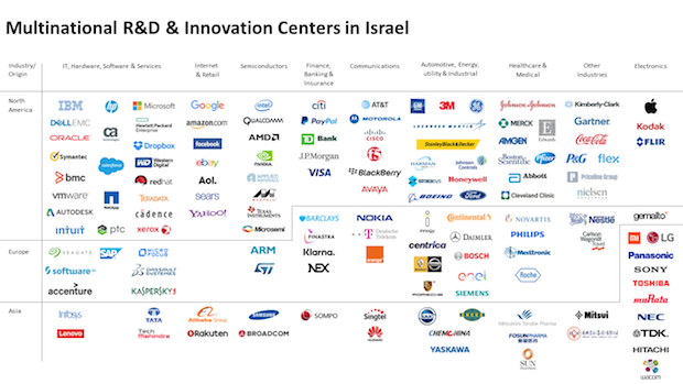 Il y a environ 350 centres de recherche et de développement multinationaux en Israël, la plupart de ces centres ont été créés après l’acquisition d’entreprises israéliennes spécialisées dans les nouvelles technologies. Les centres de recherche et de développement forment une part importante de l’écosystème d’innovation israélien. Ils créent de la valeur technologique non négligeable : ils représentent en effet environ 50% des investissements en recherche et développement. De plus, ces centres de recherche et de développement ont un effet positif sur l’économie, en termes de salaires et de productivité. Les employés des centres de recherche et de développement passent aussi par différents acteurs du secteur des hautes technologies au cours de leur carrière, leur permettant ainsi de " distribuer " les compétences technologiques et managériales acquises. Dans le monde professionnel, ce phénomène est connu sous le nom de " débordement ", selon l’édition 2017 du rapport de l’Autorité Israélienne de l’innovation.