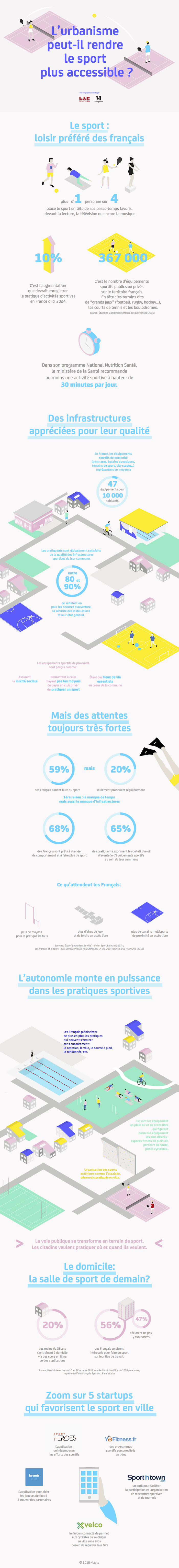 Sur la question des usages, l’infographie souligne une mutation de la pratique sportive : les Français plébiscitent avant tout les sports qui peuvent se pratiquer sans encadrement comme la natation, le vélo, la course à pied… En parallèle, on assiste à une urbanisation des sports extérieurs - comme l’escalade par exemple - qui peuvent désormais se pratiquer également en ville. Le domicile devient lui aussi un terrain de jeu pour la pratique sportive : 20% des moins de 35 ans s'entraîneraient à domicile via des cours en ligne ou des applications. Un constat majeur ressort : les citadins veulent pouvoir pratiquer où et quand ils veulent.