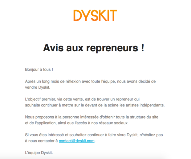 À ce stade, aucun repreneur ne s'est manifesté. Les fondateurs de Dyskit se laissent un mois pour voir venir, en fonction des retours. "Tout ce qu’on sait c’est qu’on veut finir la tête haute. Il ne faut pas voir cette histoire comme un échec, il faut en tirer des leçons. Et la première d'entre elles, c'est de croire en son idée, mais aussi de savoir accepter l’échec" conclut Emilien Gelis.