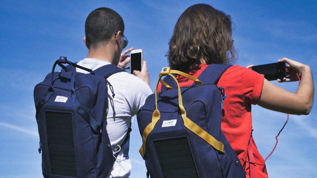 Avec le Jetpak01 de Uvé, on peut charger son smartphone très simplement avec l'énergie du soleil. La batterie à l'intérieur du sac accumule l'électricité pendant la journée et permet ensuite de charger nos smartphones n'importe où.