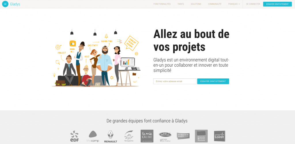 Alors, pour donner les moyens aux organisations de devenir davantage agiles, collaboratives afin d’être plus innovantes, nous avons imaginé Gladys : une plateforme où tous les intervenants d’un projet (collaborateurs, clients, fournisseurs, consultants) se retrouvent pour échanger, travailler et innover ensemble.
