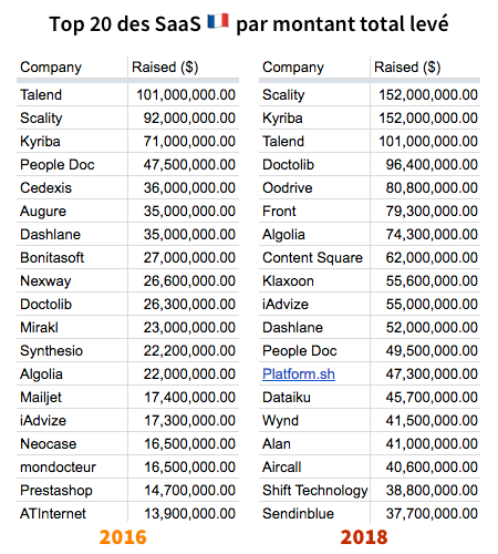 Début 2016, il fallait avoir levé au moins 14 millions de dollars pour entrer dans cette liste. Ce chiffre a quasiment triplé pour atteindre 40 millions de dollars en 2018. Le top dix a également été largement renouvelé puisque seulement trois SaaS du top dix en 2016 font encore partie du top dix en 201. Une nouvelle génération de ”champions” est venue bouleverser le paysage (Algolia, Front, Klaxoon, ContentSquare…). Et ce renouvellement a lieu à tous les niveaux puisque de nombreuses startups très prometteuses ont levé des montants significatifs sur les derniers 24 mois : le montant médian levé par startup (listées sur notre carte) est passé de 2,5 millions de dollars en 2016 à 7 millions en 2018.