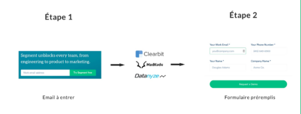 L’utilisateur n’a plus qu’à entrer son email, les APIs de Clearbit couplées à Madkudu et Datanize faisant le reste du travail. Le formulaire est déjà pré-rempli.