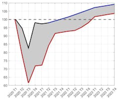 Ces mesures exceptionnelles ont eu pour contrepartie d’accroître le ratio de dette sur PIB, celui-ci atteignant 115 %. Toutefois, notre analyse montre que si le gouvernement n’avait pas pris ces mesures, alors le ratio de dette aurait pu atteindre 145 % compte tenu de l’effondrement de l’activité.