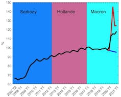 La dette publique en pourcentage du PIB a augmenté de plus de 20 points durant le quinquennat de Nicolas Sarkozy, principalement du fait de la crise financière de 2008-2009. Pendant le quinquennat de François Hollande, elle a lentement progressé, alors que cette période ne connaissait aucune crise majeure (pendant cette période, la dette allemande est passée de 88 % à 70 % du PIB), pour se stabiliser autour du niveau de 100 % du PIB au début du quinquennat d’Emmanuel Macron.