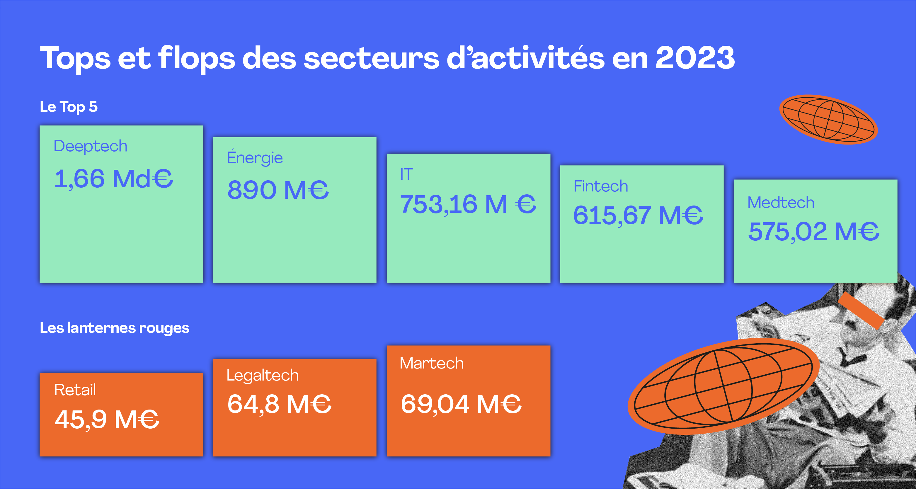 En deuxième position, on retrouve l'énergie, un secteur qui présente aussi des similarités avec la Deeptech étant donné le degré de technicité et de recherche que requièrent certains projets. Nul doute que la méga-levée de 250 millions d'euros réalisée par la startup DriveCo en mai dernier a permis au secteur de se hisser au top 3. Nouvel arrivant au top du classement également cette année : l'IT a regroupé plus de 753 millions d'euros en 2023. Cette fois-ci, l'appétit grandissant pour les projets d'IA générative est en cause, en particulier les deux méga-levées successives de la part de Mistral AI - 105 millions d'euros en juin et 385 en décembre.