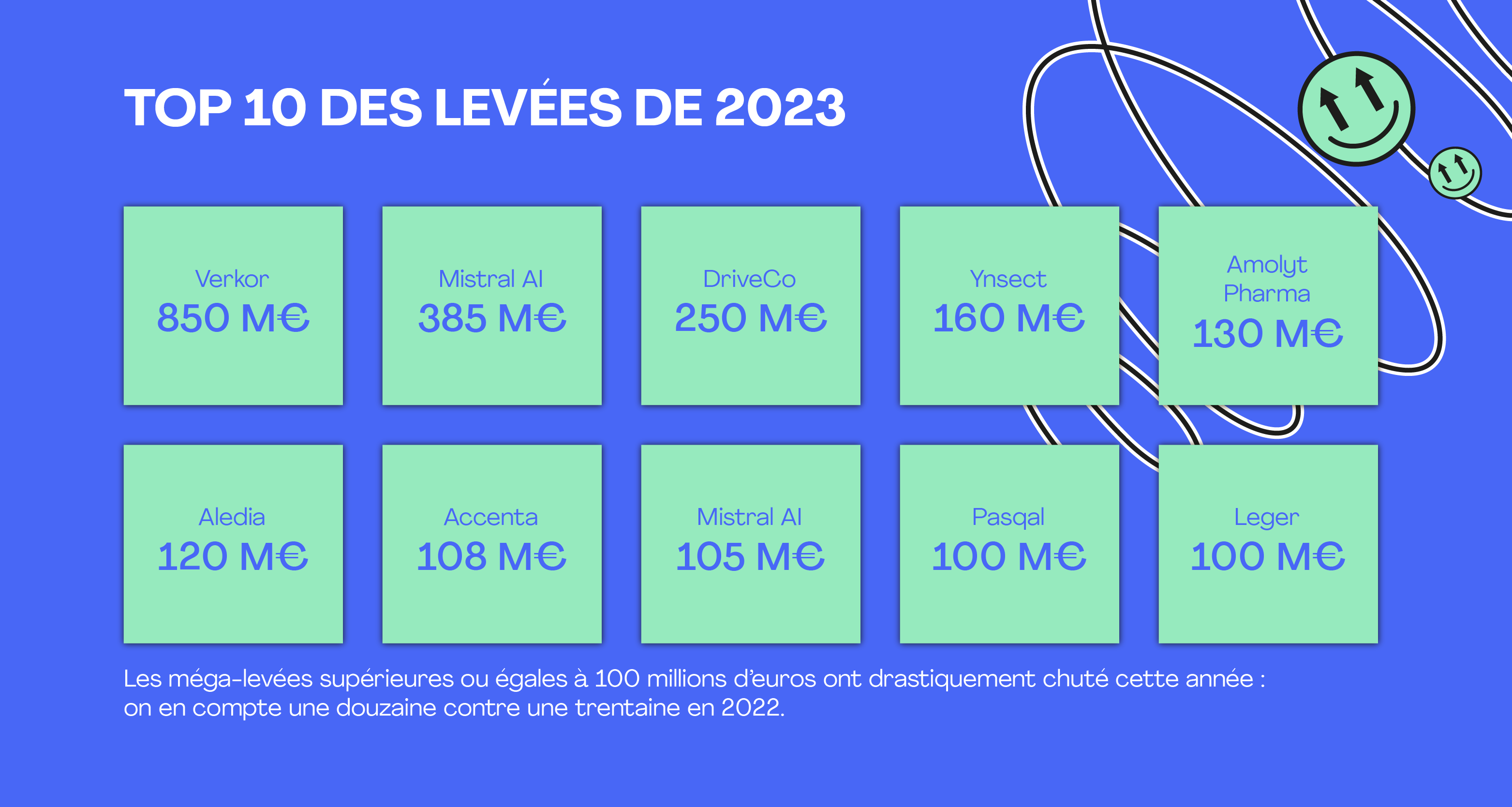 Si on s'intéresse au top 10 de l'an passé, celui-ci avait engrangé 3,6 milliards d'euros, soit près d'un tiers du montant total des levées de fonds. Le top 10 de cette année dépasse timidement la barre des 2,3 milliards d'euros - soit 27% du montant total tout de même. Ces chiffres signifient deux choses : le haut du classement est occupé par des tours de table d'envergure tandis que le reste des fonds est alloué à des projets en nombre. Les méga-levées supérieures ou égales à 100 millions d'euros ne sont cette année qu'une douzaine, contre une trentaine en 2022 et une vingtaine en 2021.