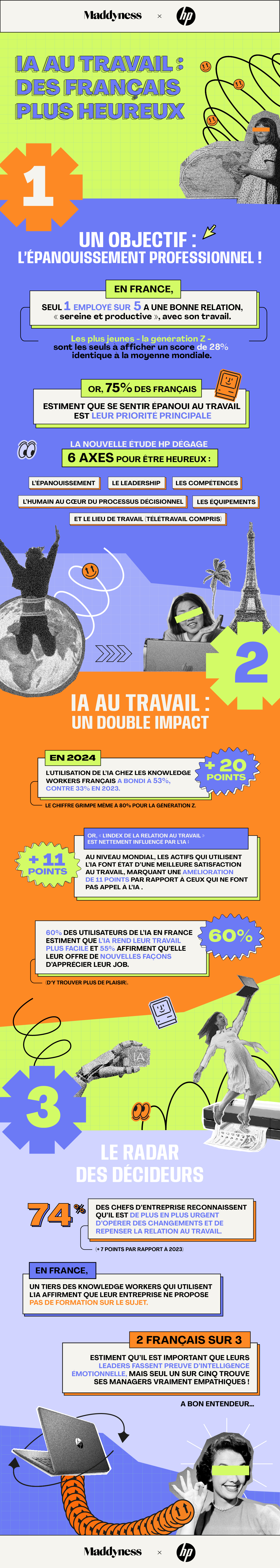 12 pays, 15 600 participants… et ce constat dressé pour la deuxième fois par l’étude HP : en France, seul 1 employé sur 5 (21%) déclare avoir une bonne relation, « sereine et productive », avec son travail. Les plus jeunes - la génération Z - sont les seuls à afficher un score de 28%, identique à la moyenne mondiale.
