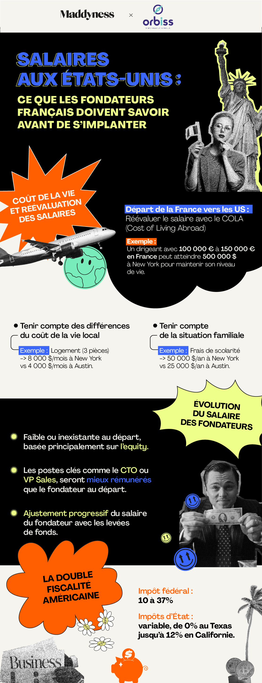 Lorsqu’un fondateur ou un salarié s’expatrie, son salaire est souvent recalibré via le COLA (Cost of Living Abroad). « Ce réajustement permet de compenser les différences de coût de la vie entre la France et les États-Unis. À New York City, par exemple, un dirigeant père de famille avec un salaire de 100 000 € et 150 000 € en France, peut atteindre 500 000 $ pour maintenir son niveau de vie », illustre Jacques Corre, Senior Manager chez Orbiss.