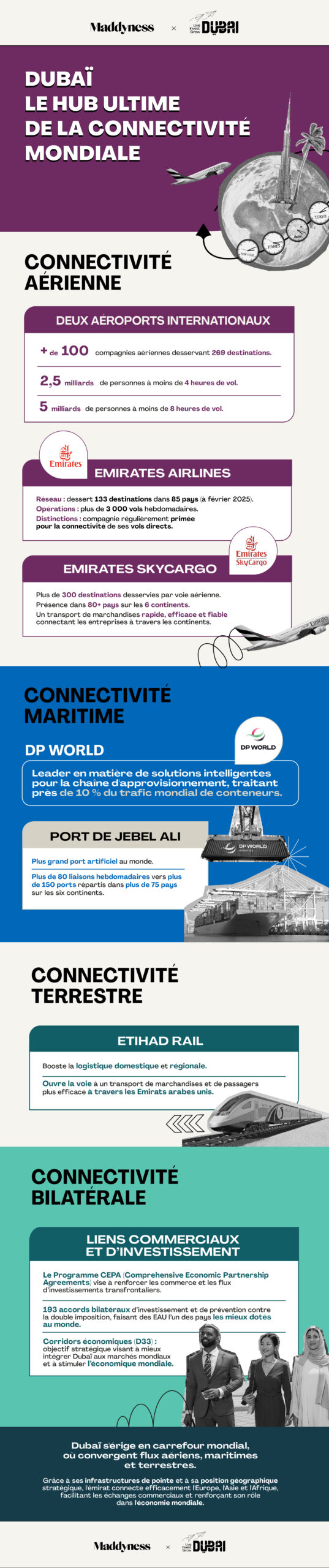 Dubaï a fait de l’hyperconnectivité un pilier de sa stratégie économique. L’émirat se classe ainsi en tête du trafic aérien mondial : l’aéroport international (DXB) demeure, pour la troisième année consécutive, le premier hub aérien du monde, desservant 260 destinations via plus de 100 compagnies. Emirates Airlines, fleuron national, relie à elle seule 133 destinations, tandis que sa filiale, Emirates SkyCargo, couvre plus de 300 destinations en export et logistique pour les entreprises.