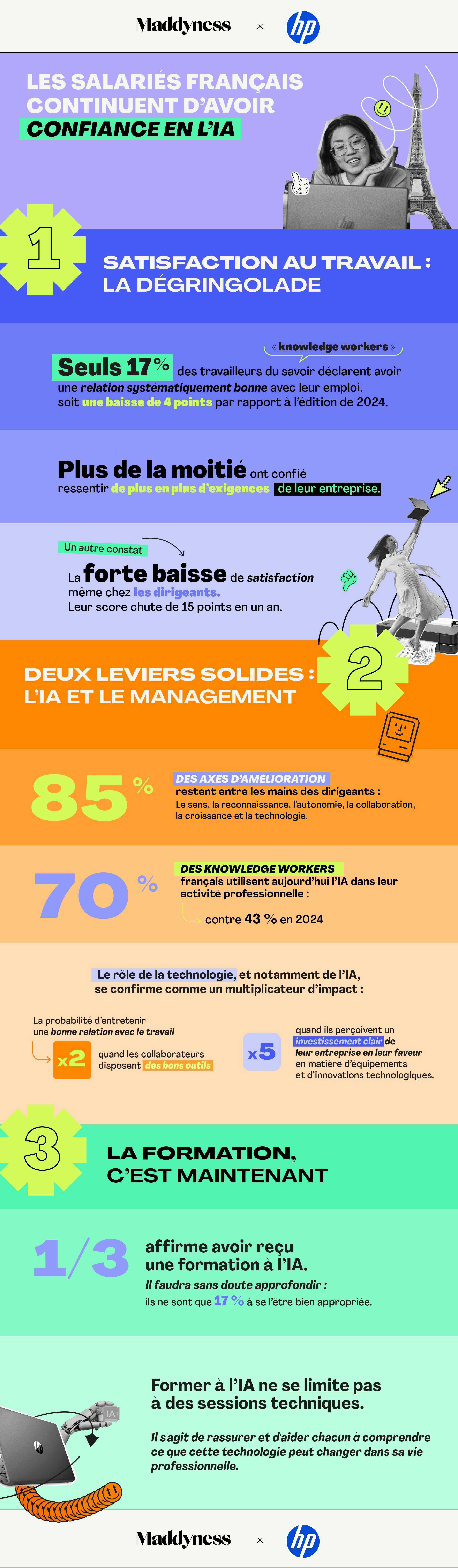 HP vient de publier l’édition 2025 de son Work Relationship Index (https://reinvent.hp.com/WorkRelationshipIndex). L’année dernière, l’étude révélait déjà que l'utilisation de l’intelligence artificielle avait bondi de +20% chez les travailleurs français du savoir (French Knowledge Workers).
