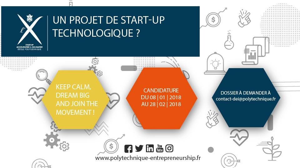 Du 8 janvier au 28 février 2018, l’accélérateur de l’École polytechnique recrute sa prochaine promotion de porteurs de projet ou de start-up « early stage ». Partout en France mais également à l’international, l’accélérateur recherche des projets à haute valeur technologique capables de créer les ruptures innovantes de demain.