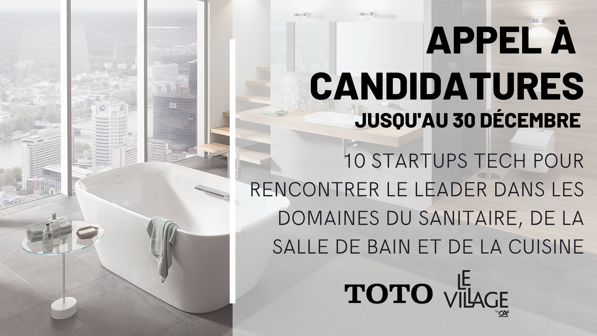 Le Village by CA Paris lance un appel à projets aux startups françaises pour rencontrer TOTO, entreprise internationale leader dans les domaines du sanitaire, de la salle de bain et de la cuisine.