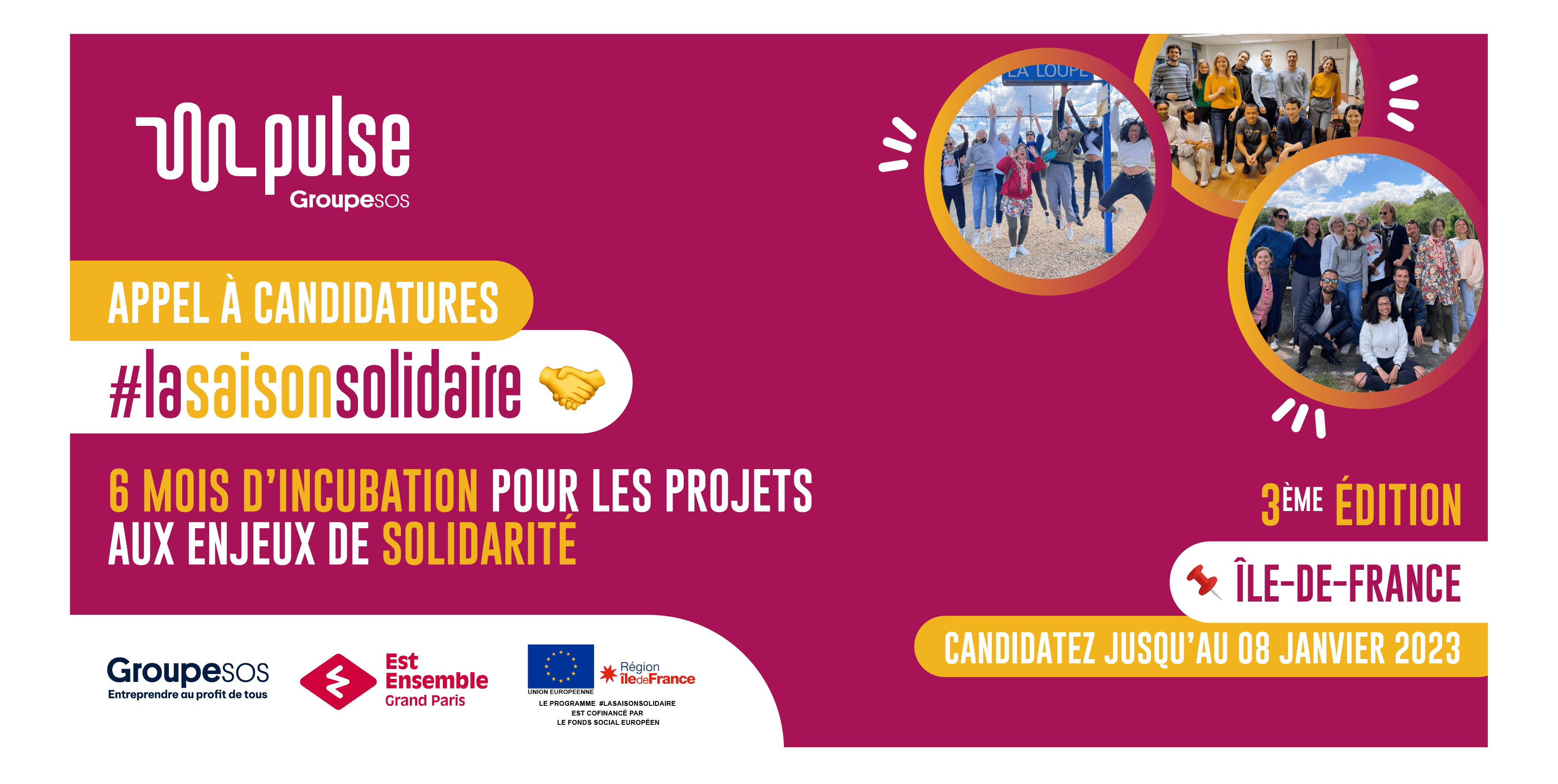 Lancée par PULSE, #LaSaisonSolidaire est un programme d’incubation de 6 mois destiné aux porteur.se.s de projets répondant à un ou plusieurs enjeux de solidarité (favoriser l’emploi & l’insertion, construire une société plus inclusive, renforcer le lien social & l’engagement citoyen*).