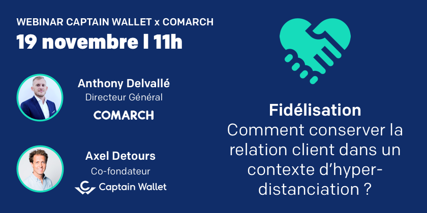 Captain Wallet, pionnier et leader du marketing sur wallet mobile, et Comarch, leader européen dans la conception, la mise en œuvre et l'intégration de services et solutions IT à forte valeur ajoutée, ont le plaisir de co-animer un webinar sur le thème : "Fidélisation : comment conserver la relation client dans un contexte d'hyper-distanciation ?"