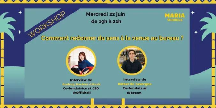 - Audrey Barbier-Litvak, CEO et co-fondatrice de chez Offishall, vient répondre à vos questions et partager ses best practices chez Maria Schools. Quand Offishall n’a plus que trois jours de présentiel obligatoire par trimestre, l’importance donnée à des retrouvailles en physique est cruciale !