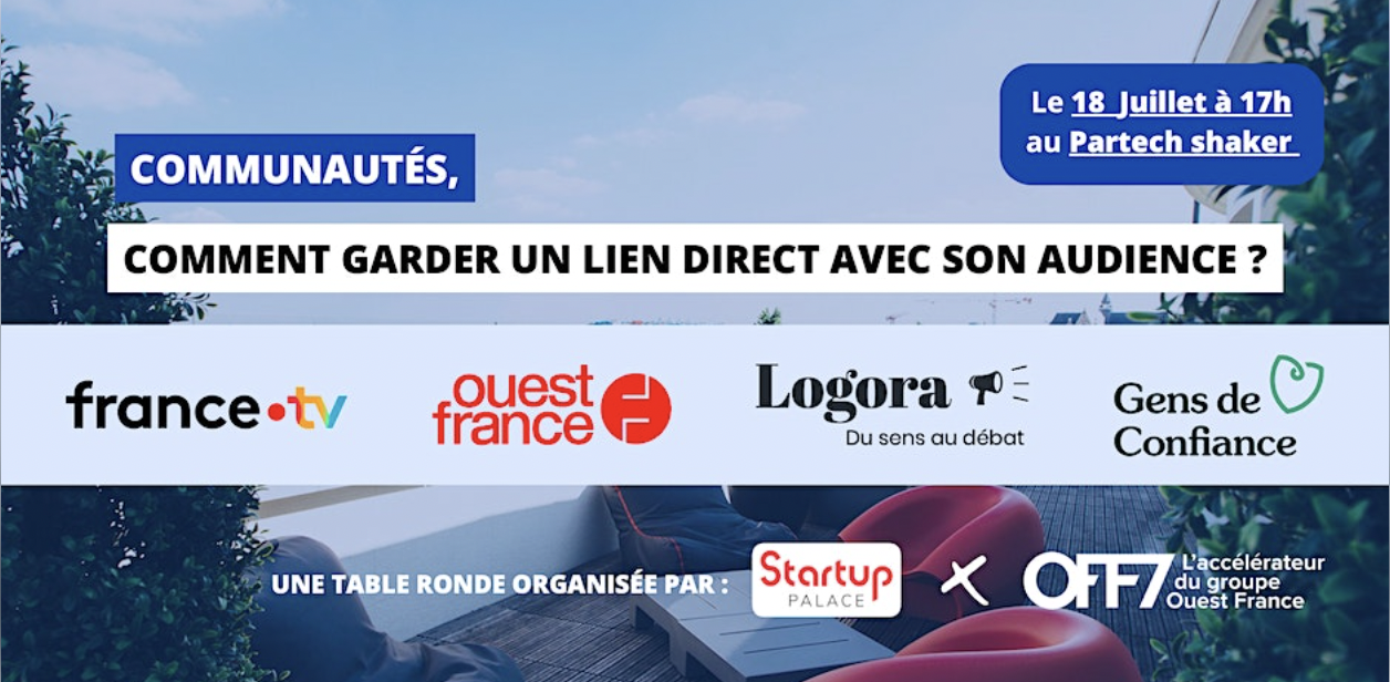 18-07-2023 12:00 18-07-2023 12:00 Europe/ParisCommunautés, comment garder un lien direct avec son audience ?Une table ronde avec le CEO de Gens de Confiance et celui de Logora associé à des intervenants de France Télévisions et de Ouest-France