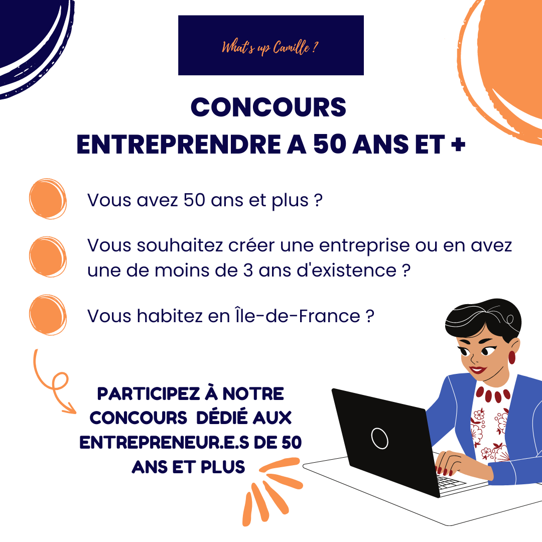 📢 What's Up Camille ? organise son deuxième concours "Entreprendre à 50 ans et plus", destiné aux entrepreneurs et entrepreneures de plus de 50 ans !