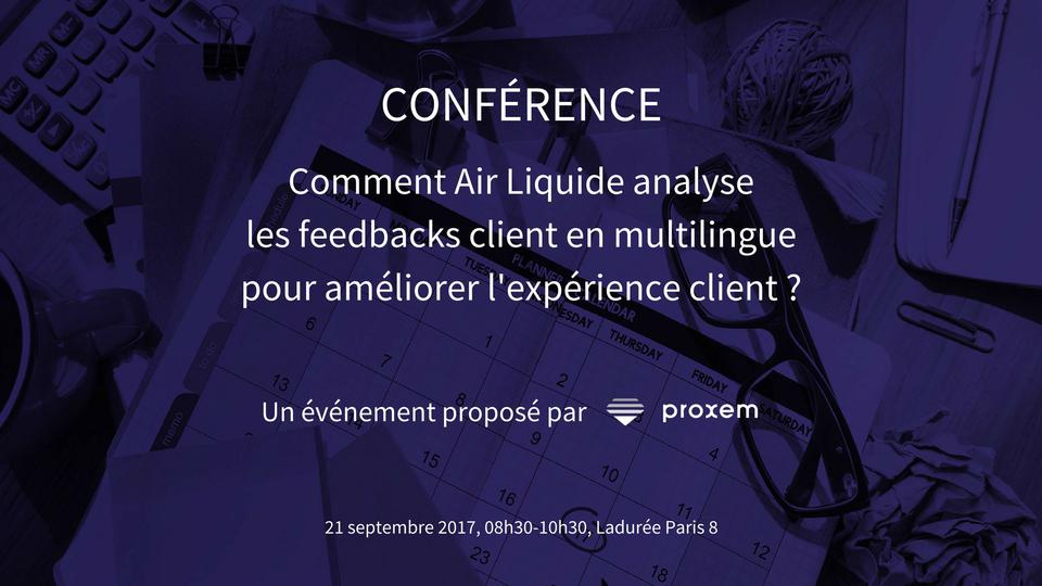 Le jeudi 21 septembre, à 8h30, chez Ladurée, François-Régis Chaumartin, CEO de Proxem, vous présentera le projet d'analyse sémantique en multilingue mené avec Air Liquide pour analyser les feedbacks clients. Vous découvrirez comment l’intelligence artificielle permet de dégager automatiquement les éléments textuels pertinents et d’accélérer les analyses et prises de décisions. Son intervention sera accompagnée des témoignages d'Air Liquide avec Audrey Eudeline, Directrice de l'Expérience Client, et Baudouin Bosquillon De Jenlis, Coordinateur de l'Expérience Client. Ces témoignages seront suivis d’un moment d’échange et de questions autour d’un petit déjeuner proposé par Ladurée.