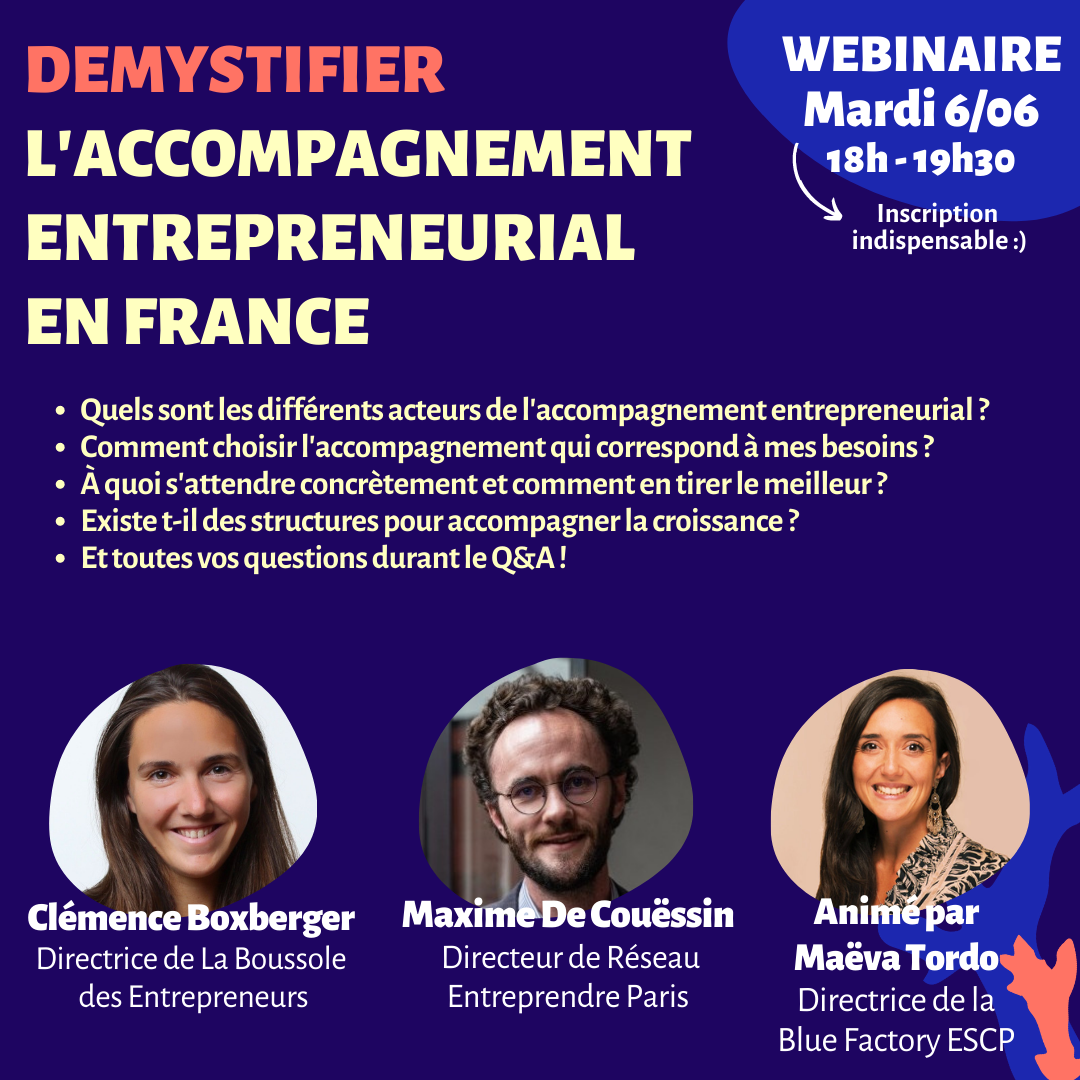 Rejoignez ce webinaire pensé pour décrypter l'accompagnement entrepreneurial français et vous permettre de connaître les différents acteurs qui aident les entrepreneurs dans la création et le développement de leur projet, avec :