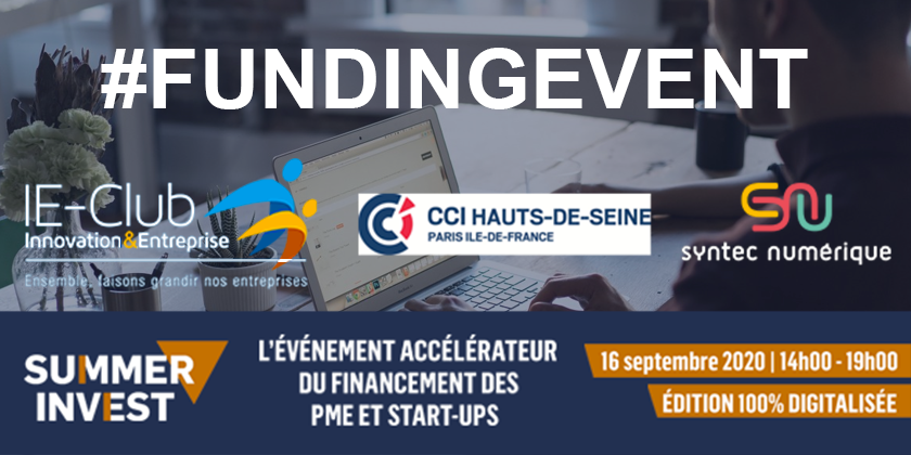 En 2020, le Funding Event IE-Club s’inscrit dans le “Summer Invest” : l’accélérateur du financement des start-ups. Cet événement 100% digitalisé, à l’initiative de la CCI des Hauts-de-Seine, se tiendra le 16 septembre 2020 de 14h à 19h.