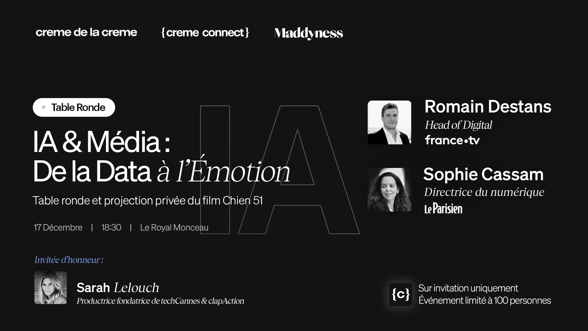 Parce que parler d’IA et de médias, c’est aussi questionner notre rapport aux récits, nous clôturerons la soirée par une projection privatisée du film Chien 51 au sein de la salle de cinéma privé de l'hôtel Le Royal Monceau : Une expérience immersive pour prolonger la réflexion autrement, par l’image et l’émotion.