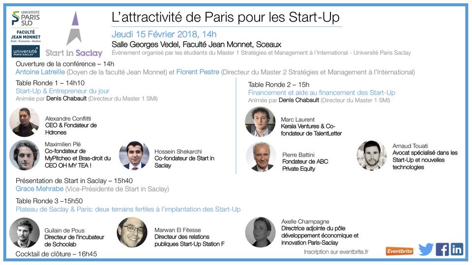 - Table Ronde 2 - 15h Financement et aide au financement des startups Animée par Denis Chabault ( Directeur du Master 1 Stratégies et Management à l'International) - Presentation de Start in Saclay. Et 15h40 Grace Mehrabe (Vice-Présidente de Start in Saclay)