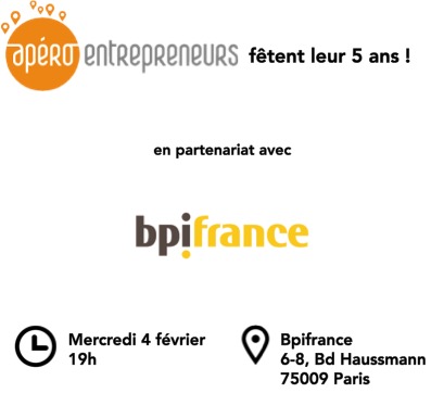 Les ApéroEntrepreneurs fêtent leur 5ème anniversaire en partenariat avec Bpifrance. Pour fêter comme il se doit cet événement, nous vous donnons RDV dans les locaux de Bpifrance le mercredi 4 février à partir de 19h. Voici 3 bonnes raisons de vous inscrire et de participer à cet anniversaire :