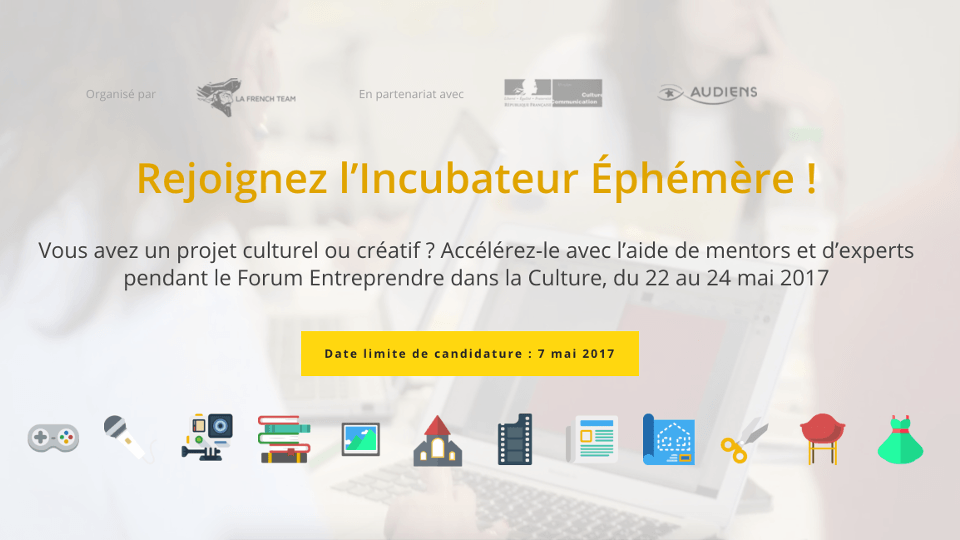 Pendant 3 jours, au cœur du Forum Entreprendre dans la Culture qui aura lieu du 22 au 24 mai 2017 à l’Ecole Nationale Supérieure des Beaux Arts de Paris, les participants sélectionnés seront accompagnés pour renforcer leur projet préexistant ou bien seront invités à rejoindre une équipe d’entrepreneurs.