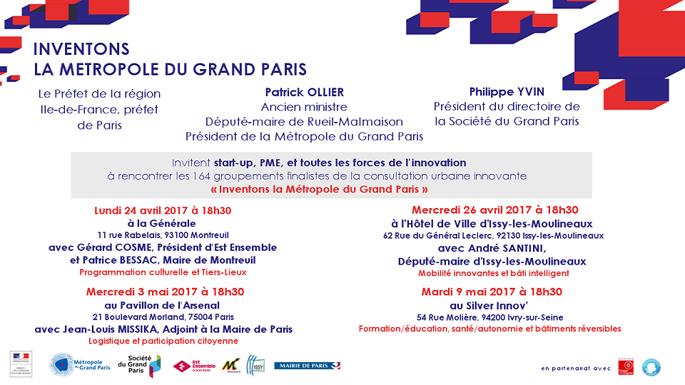 24-04-2017 12:00 09-05-2017 12:00 Europe/ParisMEETUP – Forces de l’innovation et groupements finalistes d’Inventons la MétropoleStartup, PME innovantes, forces vives de l’innovation, Venez rencontrer les groupements finalistes de la grande consultation urbaine « Inventons la Métropole du Grand Paris ».