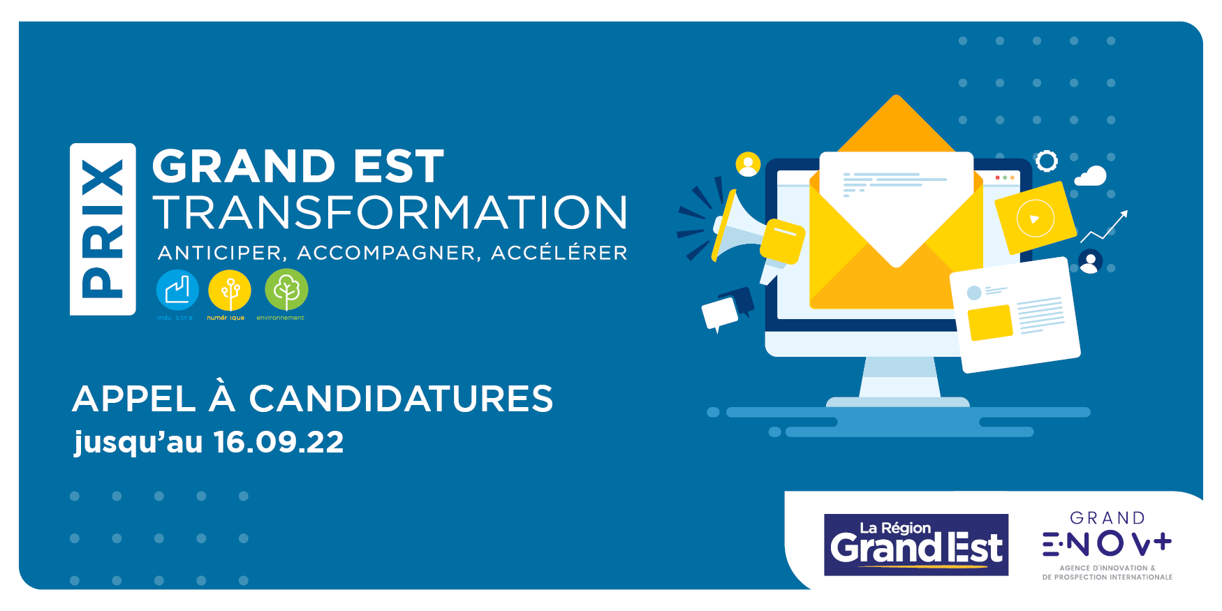 Dans la continuité du déploiement des GET (Grand Est Transformation), la Région Grand Est lance une nouvelle initiative opérée par Grand E-Nov +, l'Agence Régionale d'Innovation et de Prospection Internationale : la première édition des "Prix Grand Est de la Transformation".