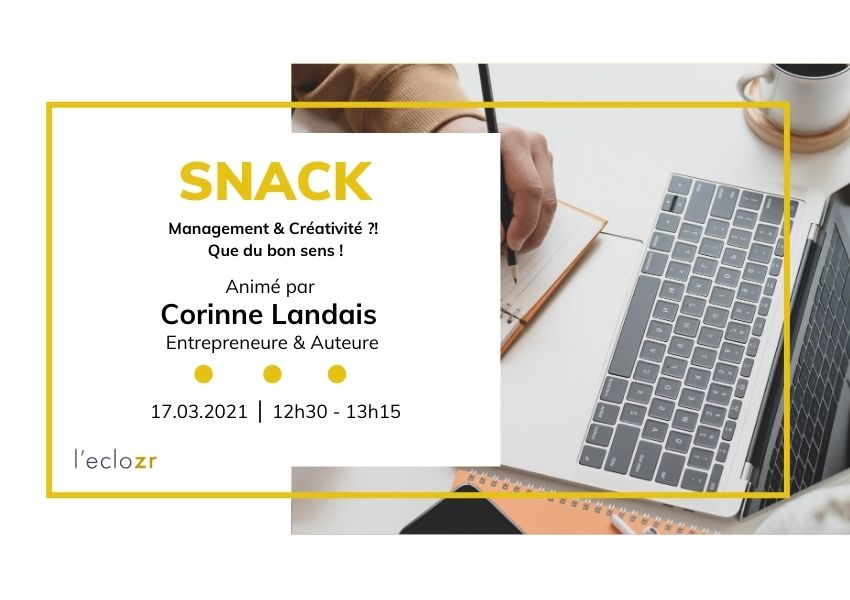 Le mercredi 17 mars, nous vous invitons à venir découvrir le lien entre "Management & Créativité", une thématique passionnante qui sera présentée par Corinne Landais lors de prochain snack de l'eclozr.