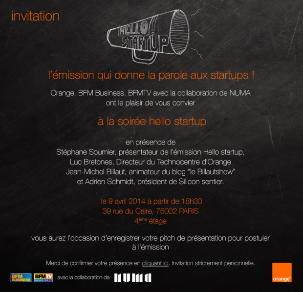 Hello Startup, l’émission qui donne chaque semaine la parole aux startups sur BFM Business et BFM TV, organise une grande soirée pour vous permettre de rencontrer ceux qui font l’émission le mercredi 9 avril à 18h30 au NUMA.[hr]