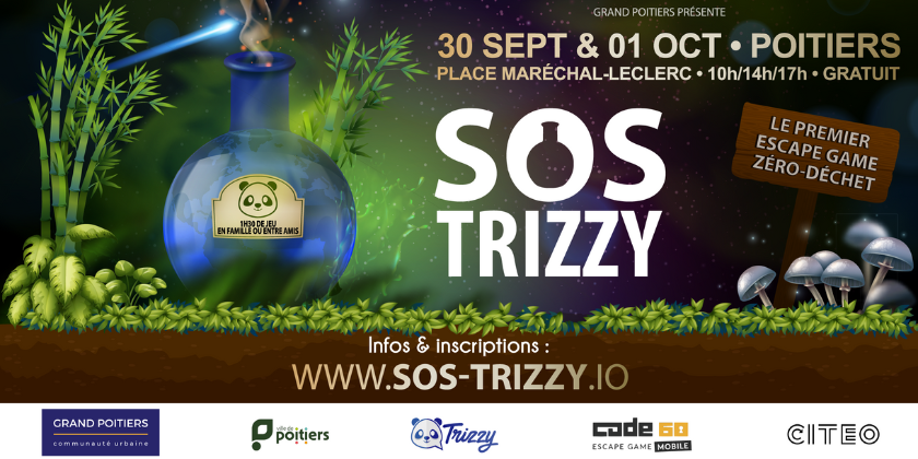 Mûri pendant deux années, ce dispositif propose 10 sessions de jeu en simultané, par groupe de 5 joueurs. Le départ du jeu se fait Place de l’Hôtel de Ville à Poitiers, pour une durée d’1h30, afin de résoudre 5 énigmes. L’objectif ? Trouver l’antidote qui sauvera Trizzy, un des derniers pandas de son espèce encore en vie et gravement malade après avoir mangé du bambou pollué. Les joueurs sont invités à se rendre sur le site du Grand Poitiers et utiliser Trizzy pour jouer, trouver les lieux où se passent les épreuves et avoir des indices. Pour parvenir à remplir cette mission, ils doivent impérativement redoubler de vigilance pour déjouer les pièges : le moindre déchet fait augmenter le taux de pollution de l’eau et de l’air et peut être fatal pour l’animal. A la fin du jeu, les résultats de chaque équipe se cumulent, une manière pour Trizzy de diffuser un message important : le collectif permet de faire bouger les choses.
