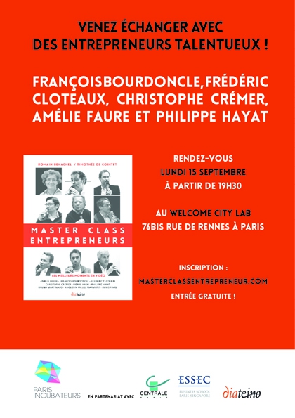 Nous vous présenterons à cette occasion l'e-book Master Class Entrepreneurs, qui reprend les meilleurs moments d'un cycle de conférences lancé il y a maintenant 2 ans en partenariat avec Paris Région Lab, l'École Centrale Paris et l'ESSEC. Pour tout savoir sur l’e-book, rendez-vous à l’adresse suivante : masterclassentrepreneur.com